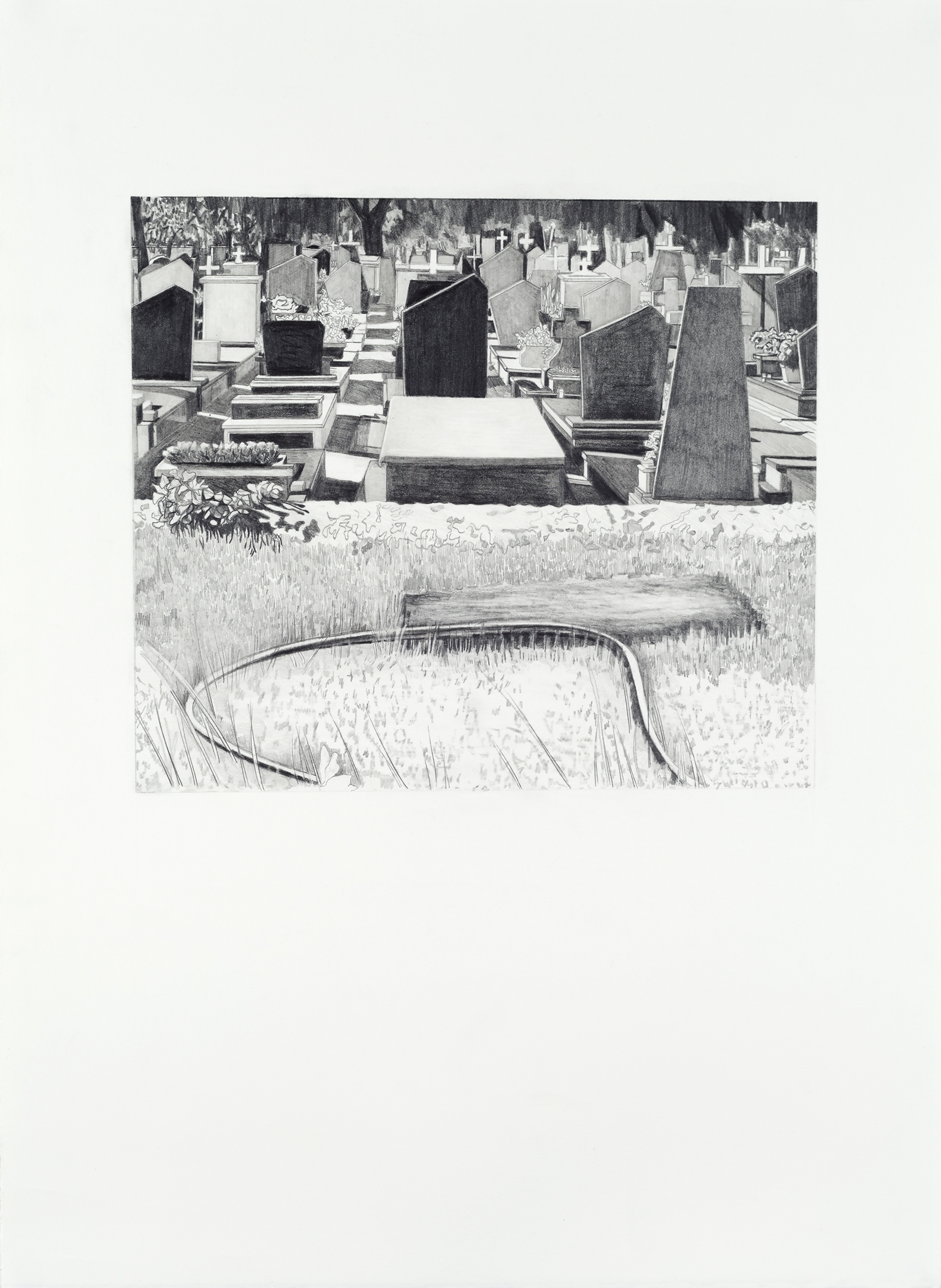 In 2015, Fay returned to Alicante after 51 years to find her mother’s grave. She tracked down and visited the apartment where the family stayed and where her mother died suddenly in 1964. She walked in the Rio Seco, the dried-up river bed where the family walked in the early evening. Back home, Fay made a series of drawings commemorating her mother as well as reimagining the trauma of losing her.